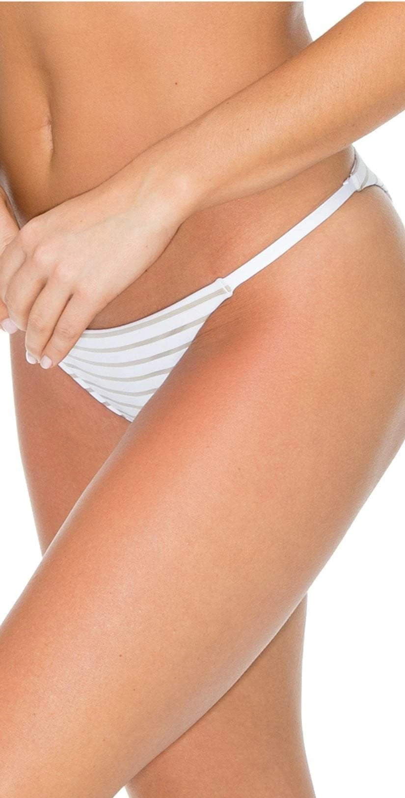 The Aerin Rose Anza Stripe Mercury Bottom is a low-rise white and opal striped bottom featuring thin side straps and cheeky coverage. This bottom pairs perfectly with the Aerin Rose Anza Stripe Tri Top.