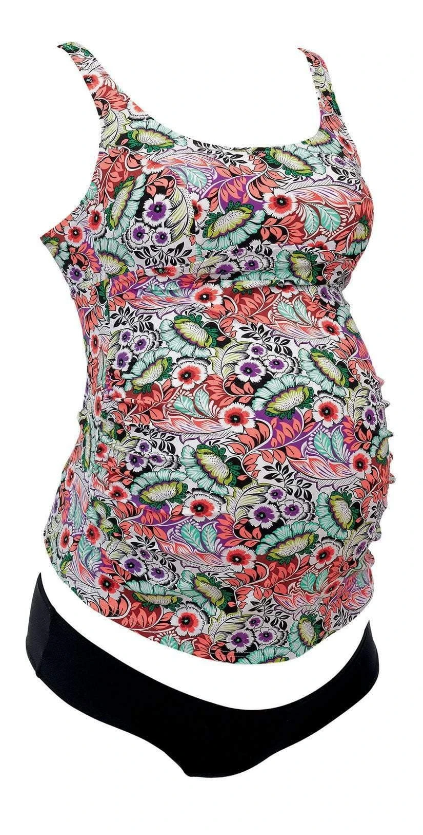 Show off your glow in the Anita Hatutu Maternity Tankini Set. The tankini top features over the shoulder adjustable straps and an exotic colorful floral design. The bust is lined and has elastic band for support. The tankini comes with solid black bottoms that offer full coverage.