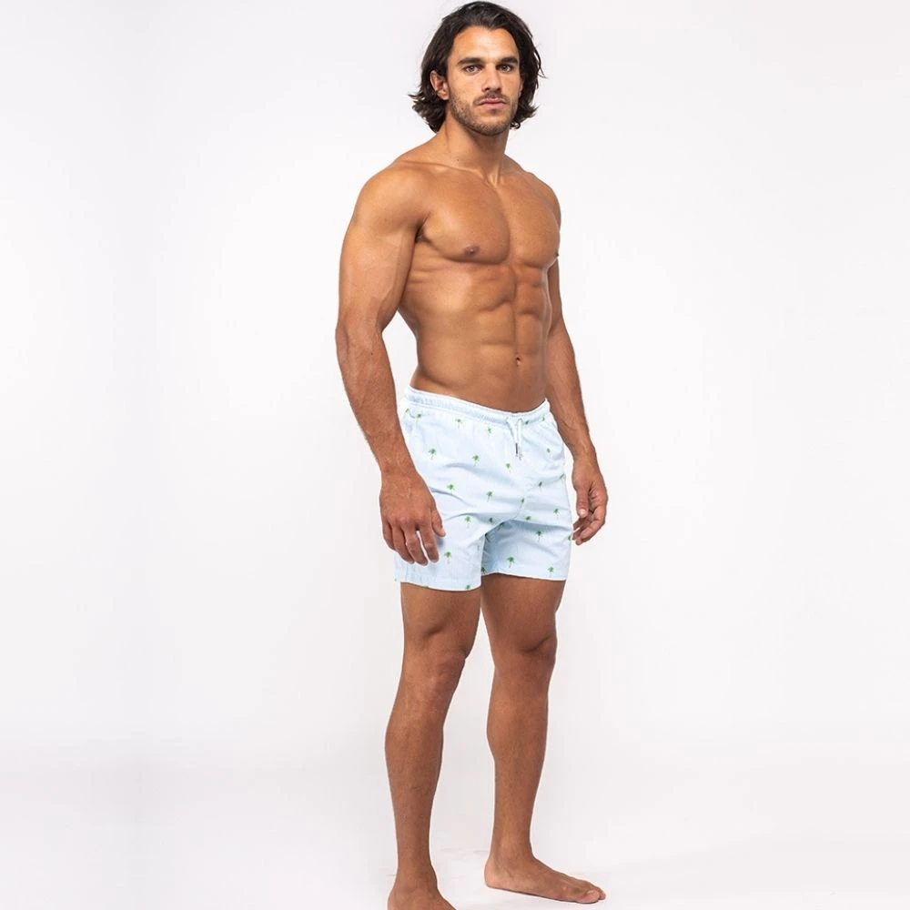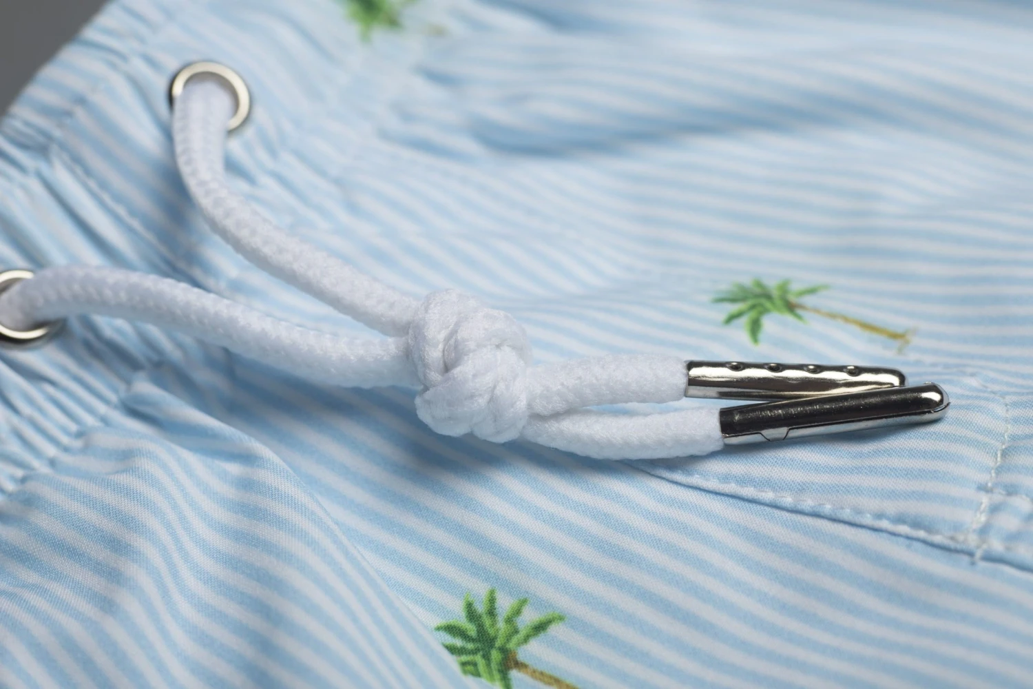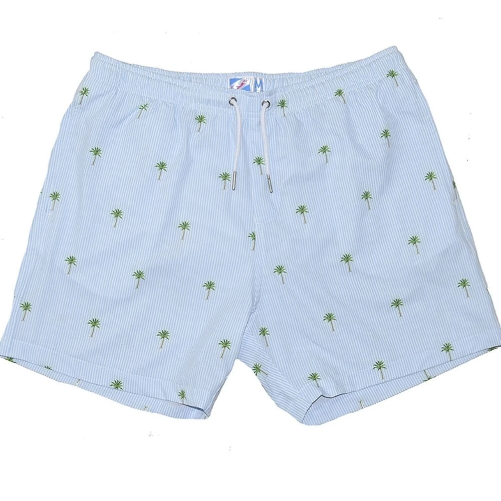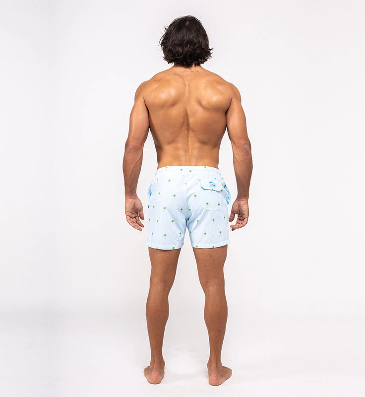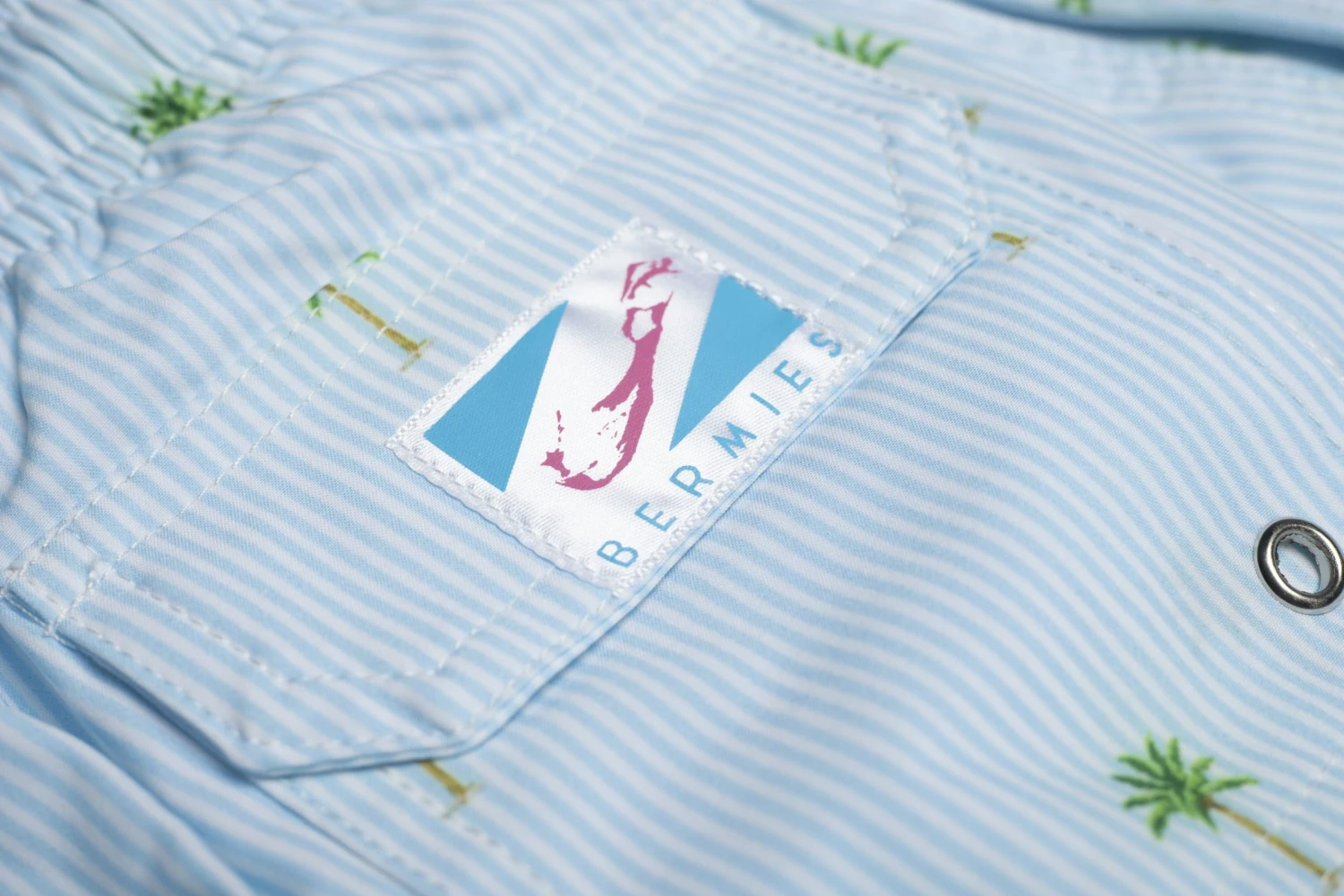 Bermies mens swim trunks are stretchy, breathable, and fast-drying for a comfortable fit. These bottoms offer a 4-way stretch, mesh liner, and pockets and are featured in a classic palm tree print with stripes.Â
