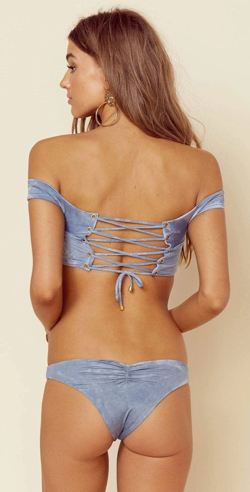 The Blue Life Rising Sun Off The Shoulder Top In Ice Blue Tie Dye has ring detail along the front and a lace-up back that has sexy off shoulder straps. This top is sexy and boho all in one. Pair with the matching bottoms here.