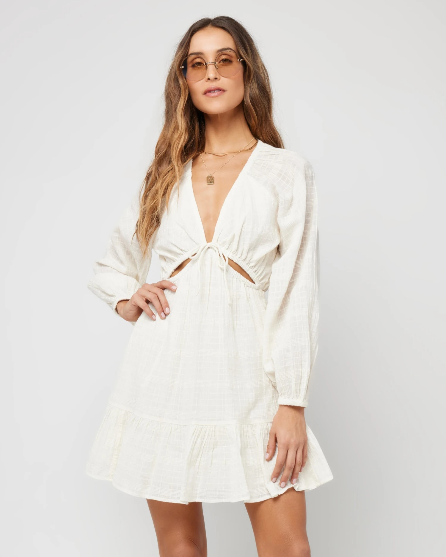 Stand out and feel good in the Feelin’ Fine Dress. This easy wear mini dress in plaid with self-drawcord is designed with a raglan sleeve, tier with shirring and cutouts in the front.