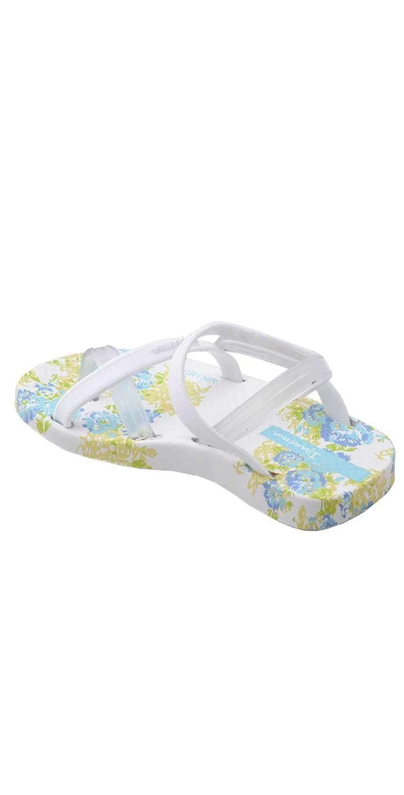 The Ipanema Baby Blanket White Sandals are cute white and blue floral patterned flip flops with velcro side strap and clear heel strap.