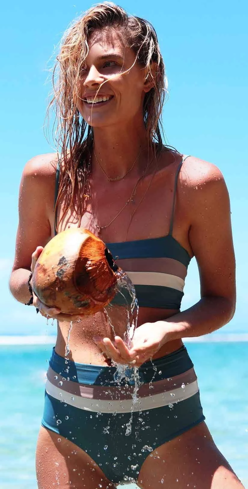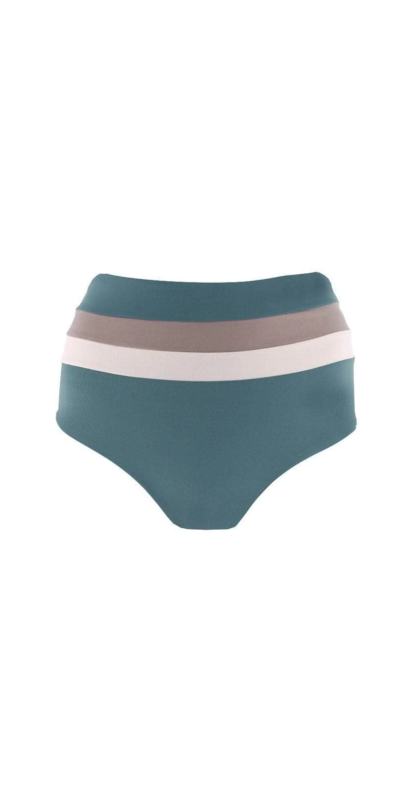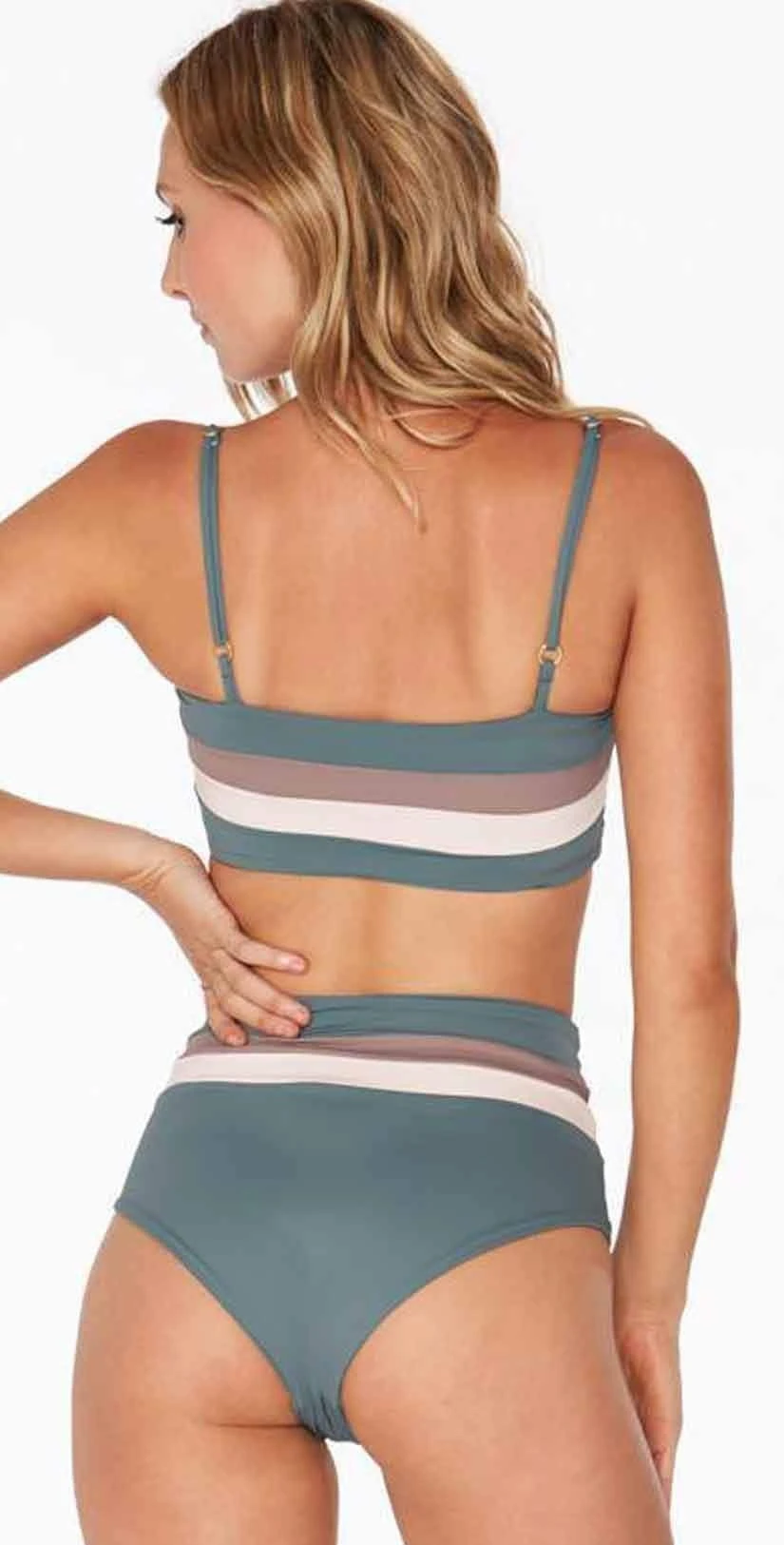 The L Space Color Block Portia Bottom in Slated Glass is a retro-style, high waist bottom featuring a green, white and taupe stripe design. Its moderate coverage in back and a seamless fit make these chic bottoms sophisticated and comfortable. Pairs perfectly with the L Space Color Block Rebel Stripe Top!Â