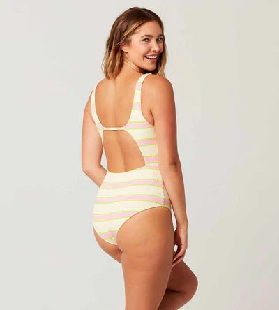 TheΒ L* Space Kylie One Piece Swimsuit is a colorful striped and ribbed one piece with a cut out front and open back.Β