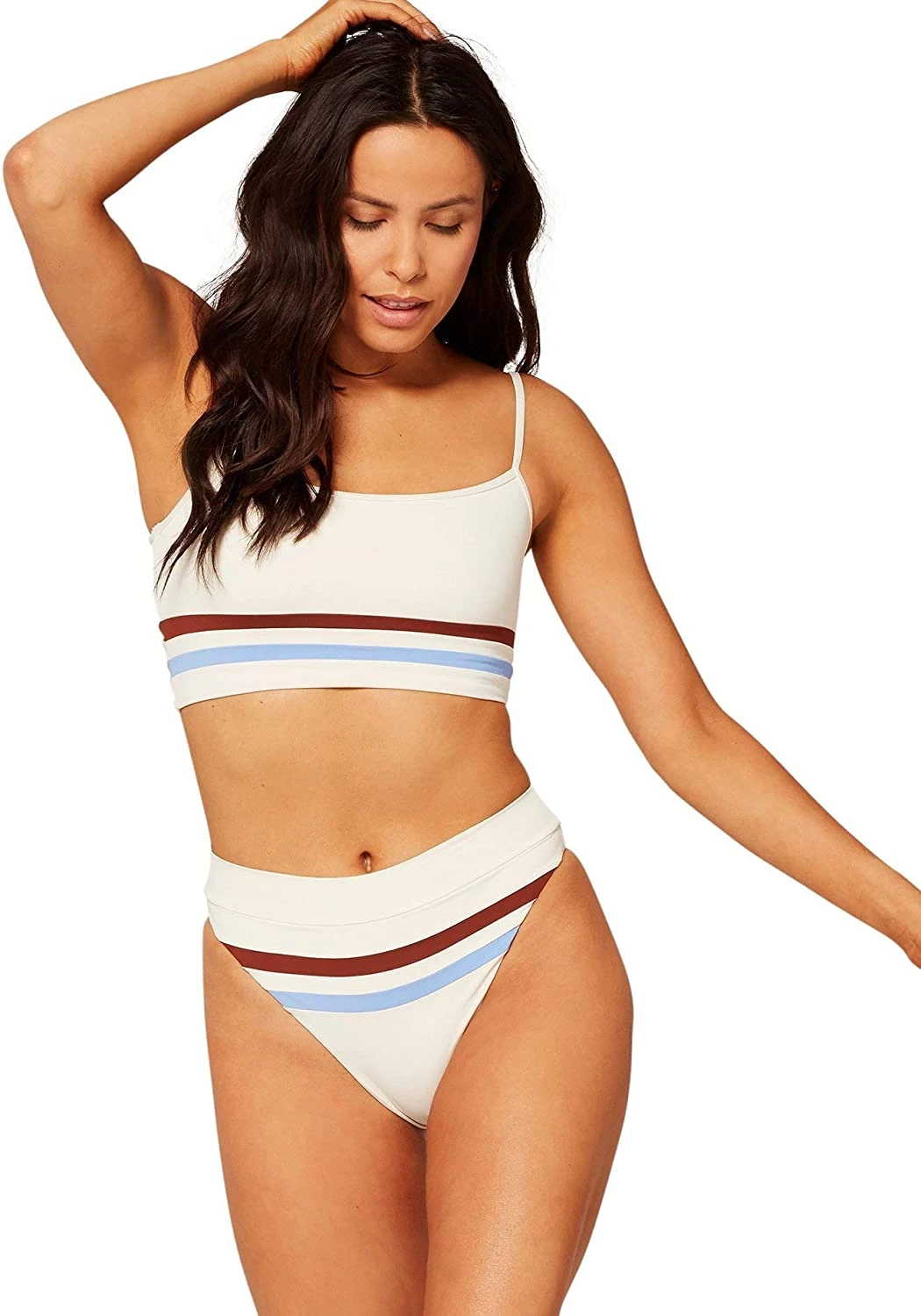 TheΒ L* Space Wilson Bottom in bitsy is a high rise high thigh bottom with brown and blue accent stripes.