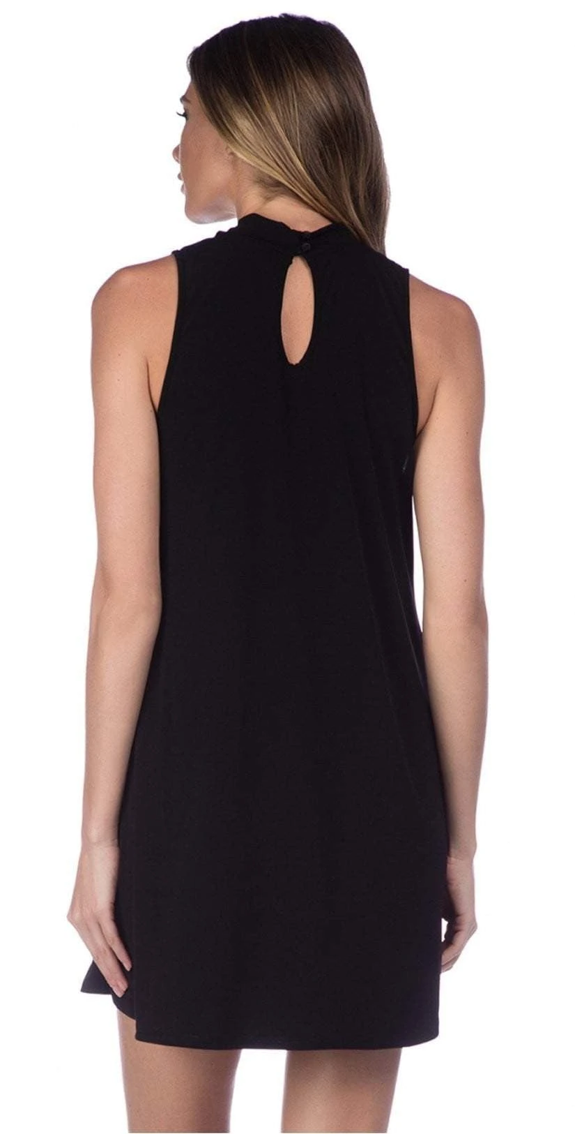 The La Blanca Undercover Mock Neck Dress features a trendy, cutout, v-neck. This dress features a button closure in back and a cute swing style, this cover-up is perfect for beach to bar!Â