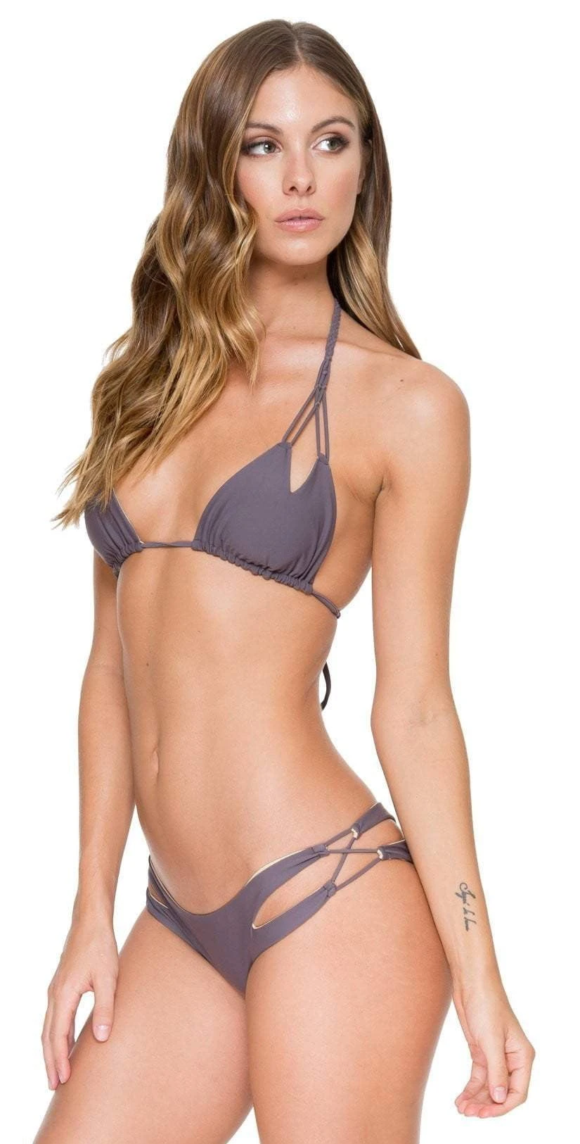 The Luli Fama Cosita Buena Open Side Bottom in Piedra Gris is a moderate coverage bottom that is purple on one side and reverses to gold. These bottoms offer a cut out detail at the hips and pair with the matching  Cosita Buena Knotted Top in Piedra Gris.