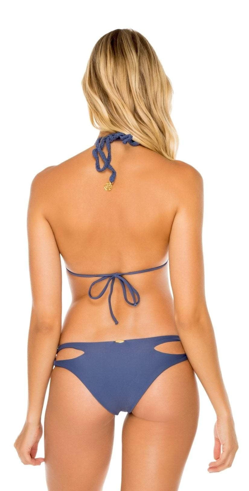 The Luli Fama Cosita Buena Reversible Zig-Zag Open Side Moderate Bottom is a moderate to cheeky coverage bottom that is blue on one side and reverses to gold. These bottoms offer a cut out detail and sit low on the hips.