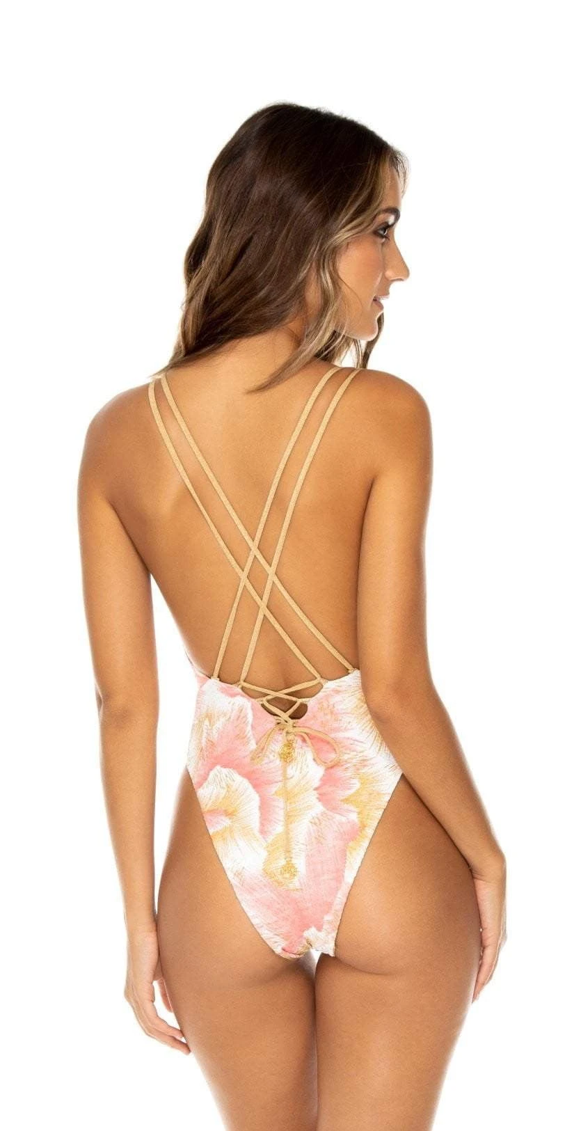The Luli Fama Costa Del Luz Reversible Deep V-Neck One Piece reverses to a solid deep gold and features a deep V-neck with criss-crossed back straps and a high cut leg. This suit offers cheeky bottom coverage.