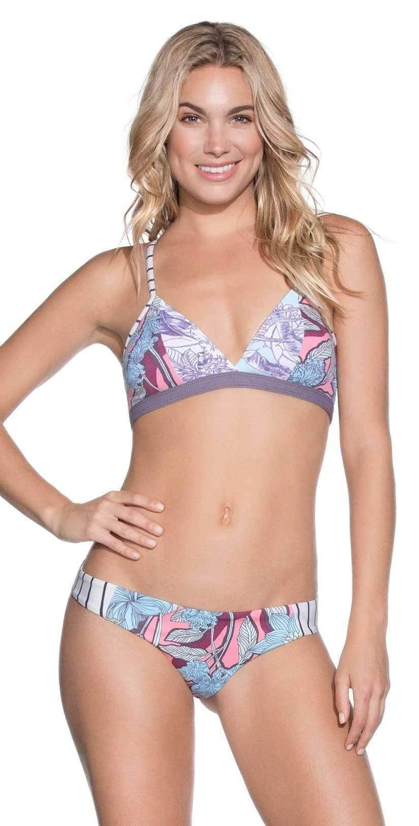 The Maaji Gorgona Spell Reversible Bottom features a mixed print front with a solid textured purple back. This low-rise hipster bottom pairs with the matching Charmed Island Lagoon Cumbia top.
