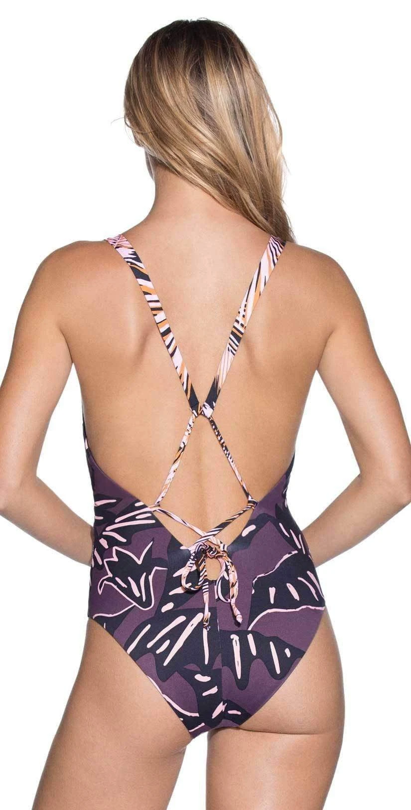 The Maaji Terquito Beach One Piece is a reversible reef patterned scoop neck with a crisscross back that reverses to solid navy blue. This one piece has thicker straps that are adjustable where it ties at the lower back and cheeky bottom coverage.