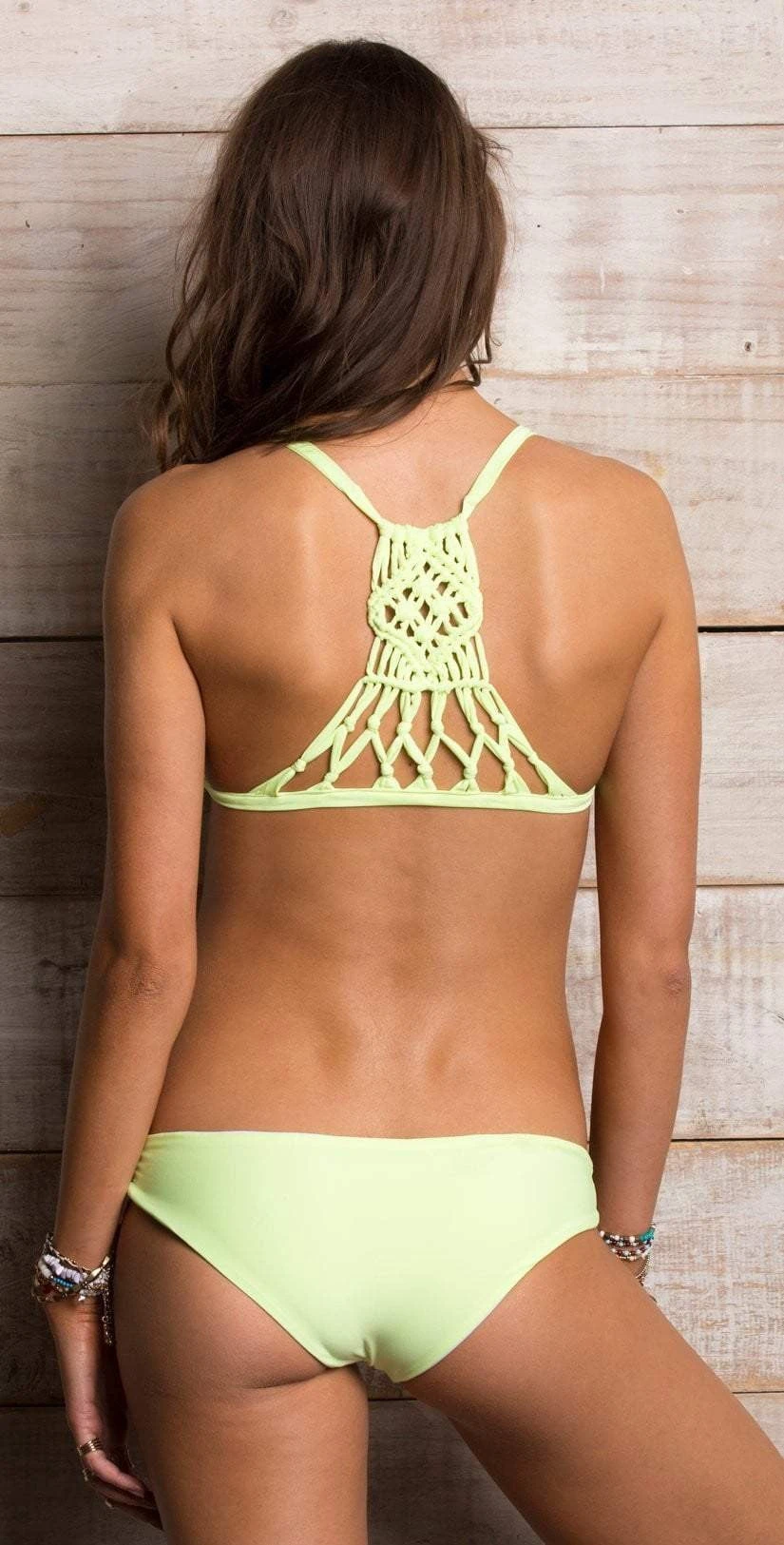 The Dante Floweret Hipster Bottom sits low on the hips and reverse to solid lime green. These bikini bottoms offer moderate back coverage and pairs with the Imani Floweret Top or the Kali Floweret Bralette Top
