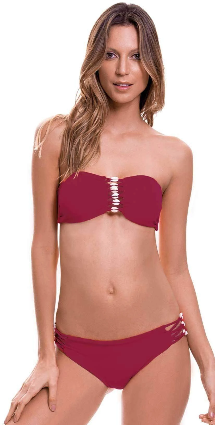 The Milonga Shell Bottom in Wine is a low-rise bikini bottom in a rich Burgundy color with a multi strap detail at the hips and shell embellishment. This bikini bottom offers moderate back coverage and pairs with the matching Milonga Shell Bandeau Top in Wine.