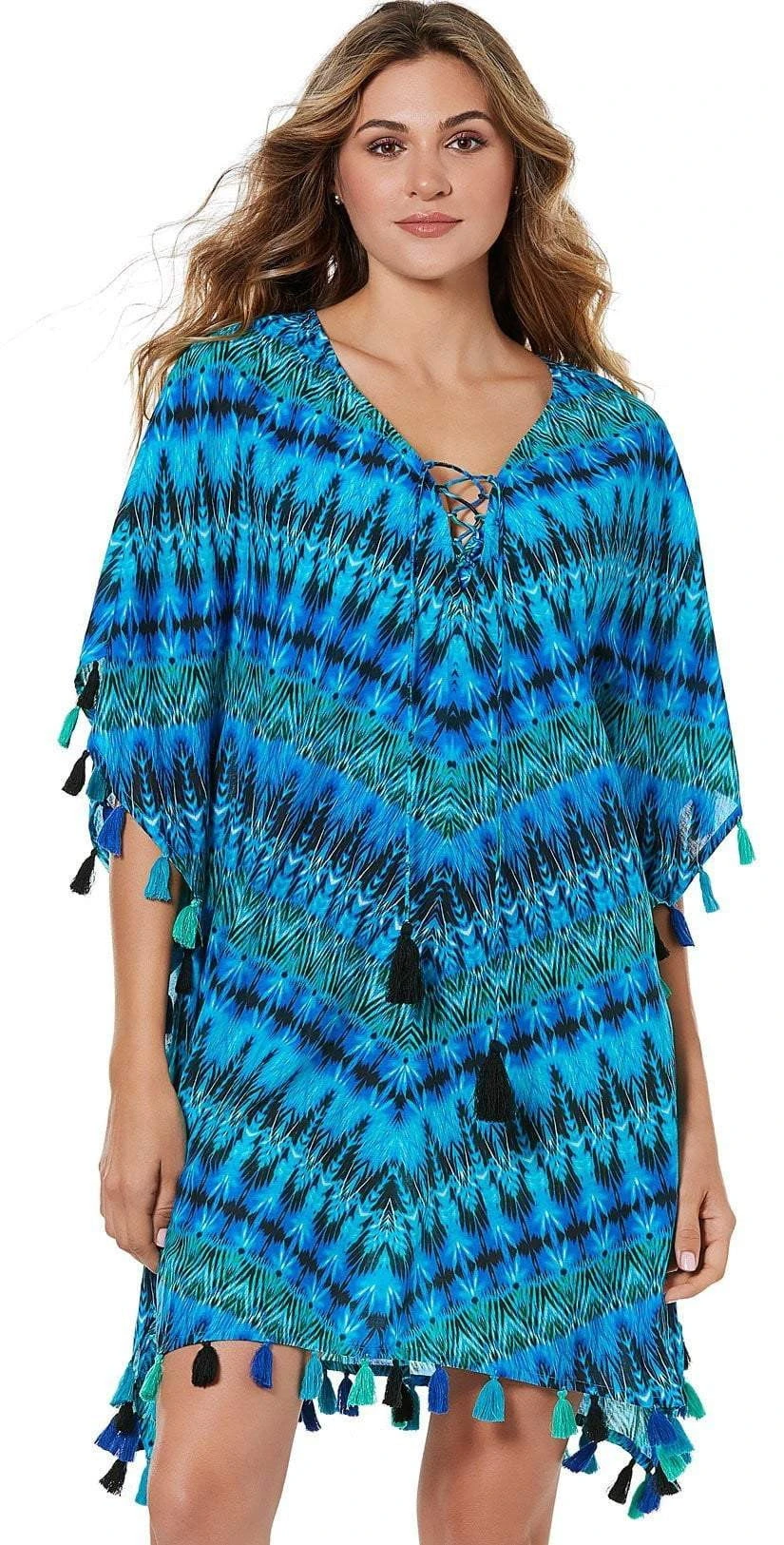 The Miraclesuit Cabana Chic Caftan is a pull over caftan with a lace up front detail. This caftan is chic and comfortable. Pair with the matching Cabana Chic Blue Peephole Tankini Top.