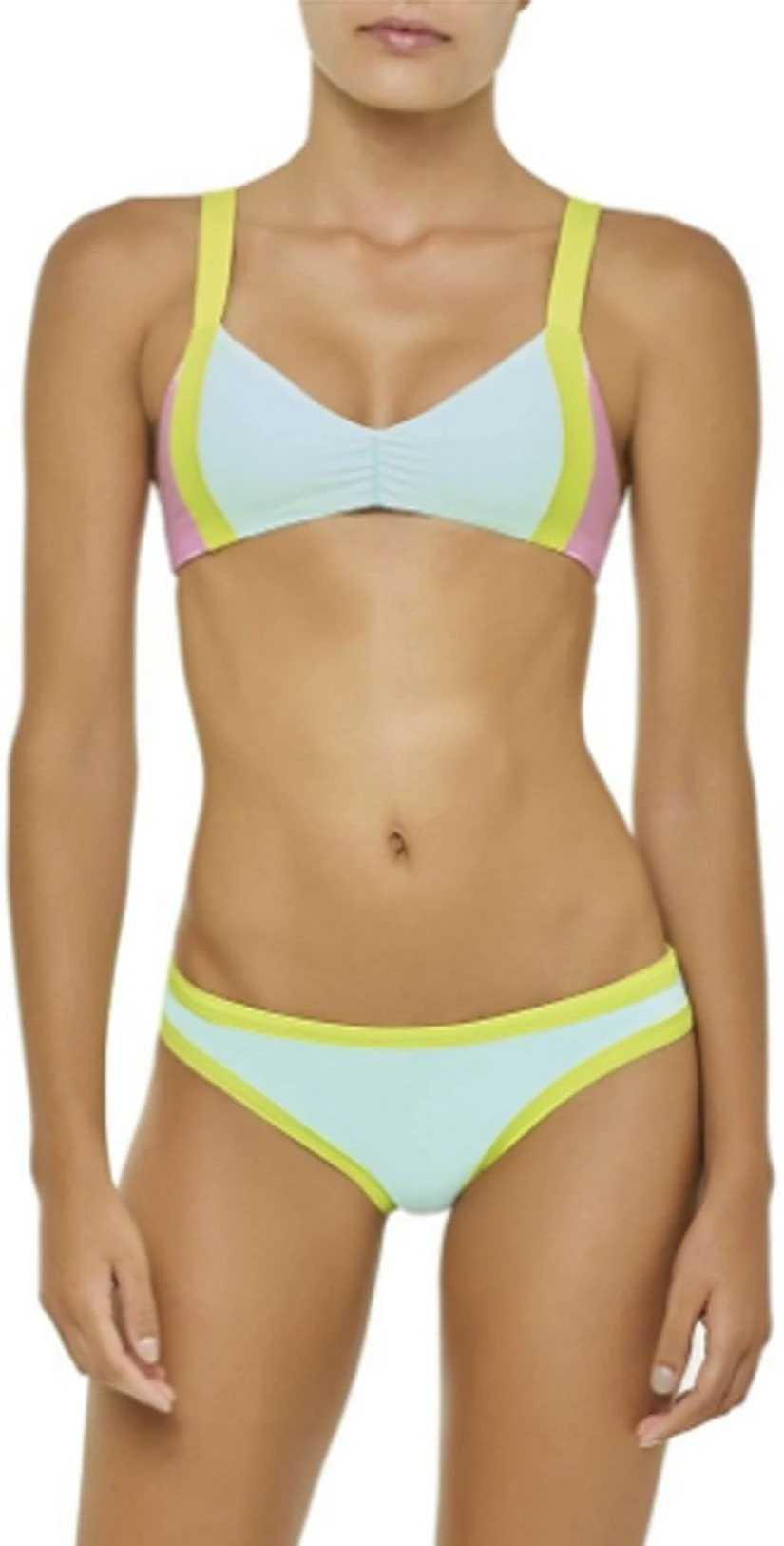This PilyQ Aruba Sporty Utopia Bikini Top features a pastel color block detail, a pullover style top with removable pads and thick sunshine yellow convertible/adjustable shoulder straps. Pair with the Aruba Sporty Bottom in Full or Teeny Cut