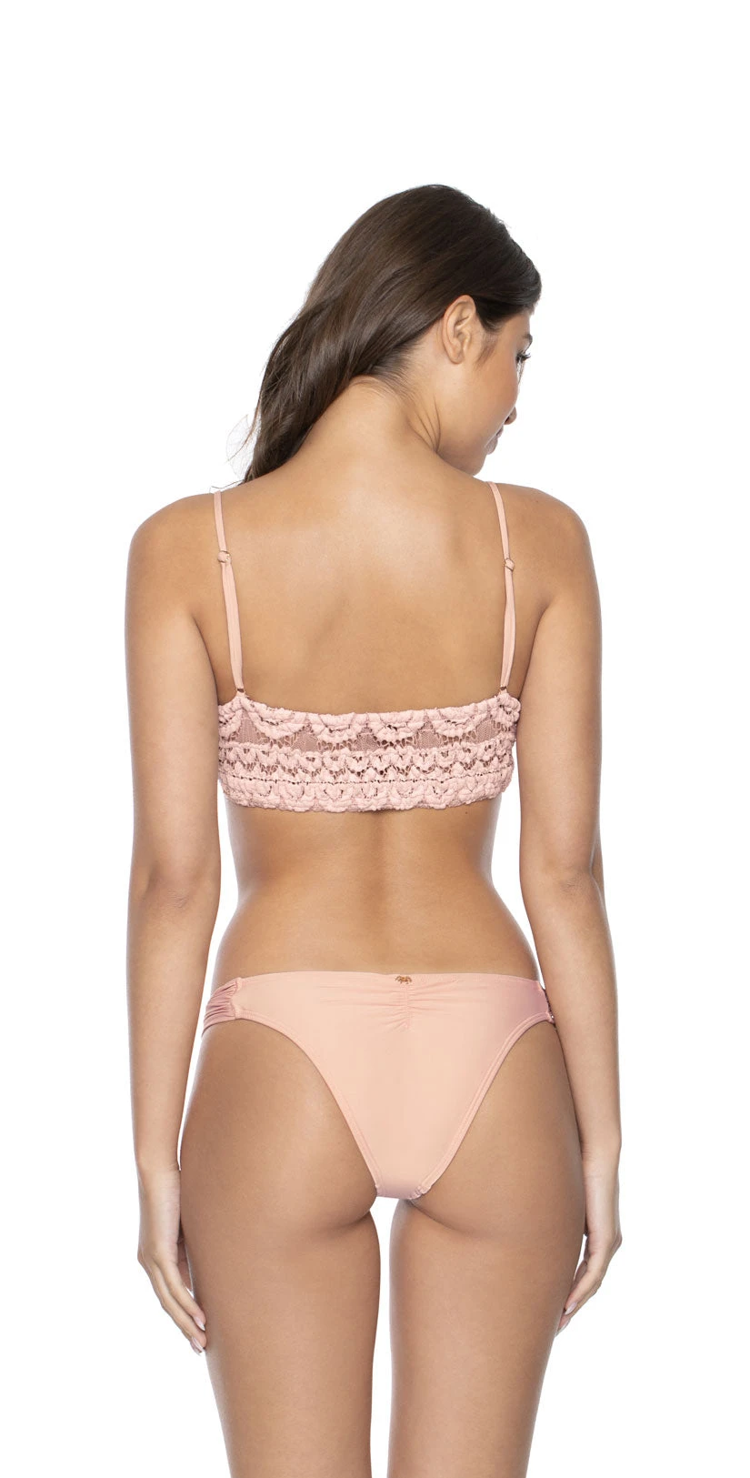 This Sweetheart Lace Bralette features nude underlining and beautiful lace trim detailing. Pair it with the matching Pink Sands Lace Fanned bikini bottoms for a sexy bikini set! This top has adjustable straps and removable padding.Â