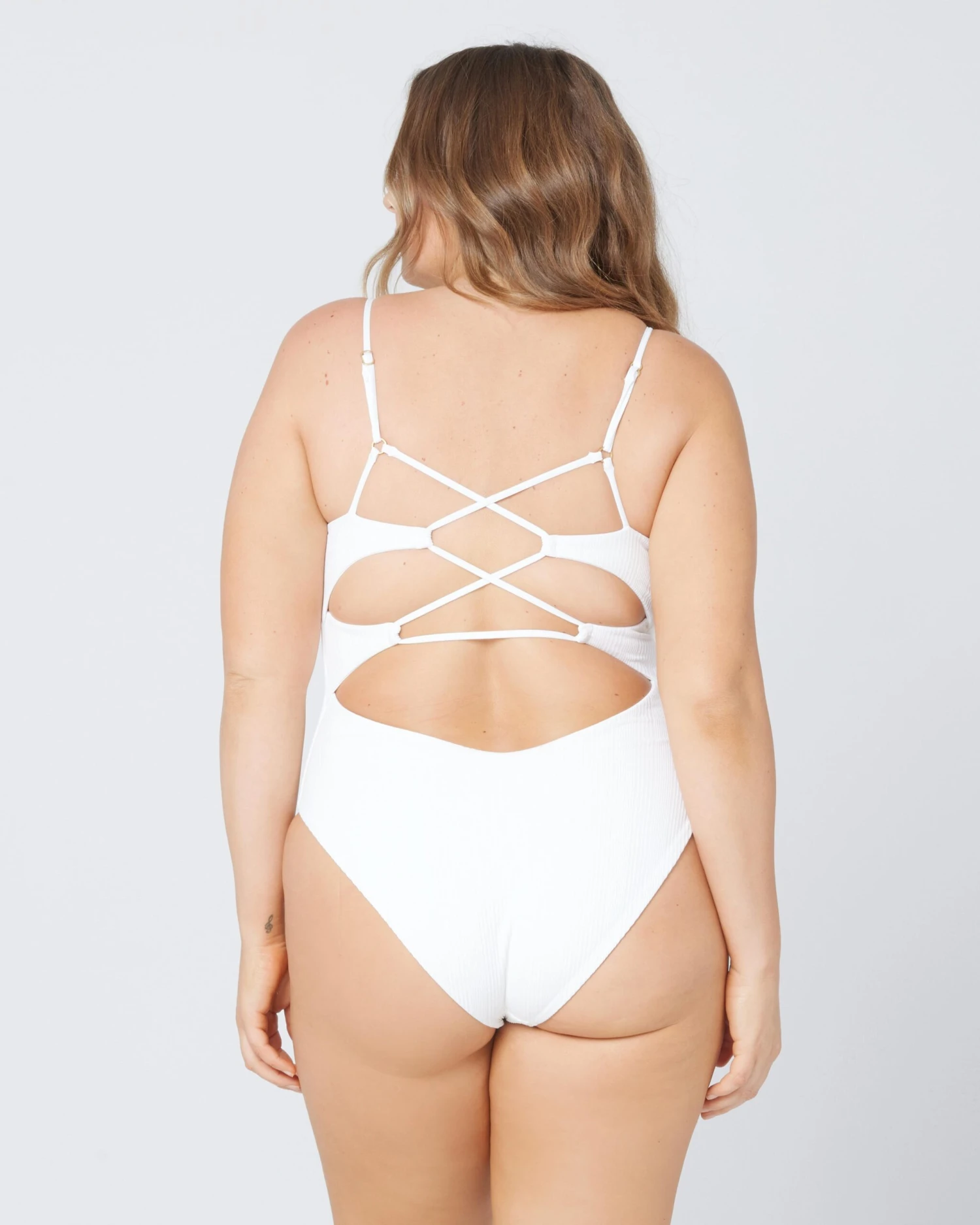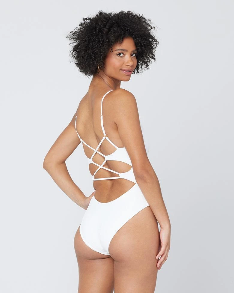 Classic in the front, sexy in the back, the Gianna has it all! This flattering pointelle rib one piece features a deep v-neck front and flattering high leg. A modern cut out back with adjustable straps adds a little edge to this sophisticated style.