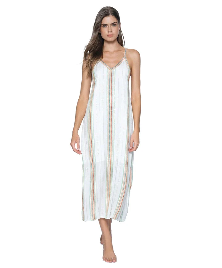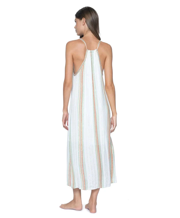 This beautiful PQ Swim dress is a midi length dress with shiny gold and colorful striped detailing. Features knee height underlining and does not have adjustable straps. The perfect summer dress!