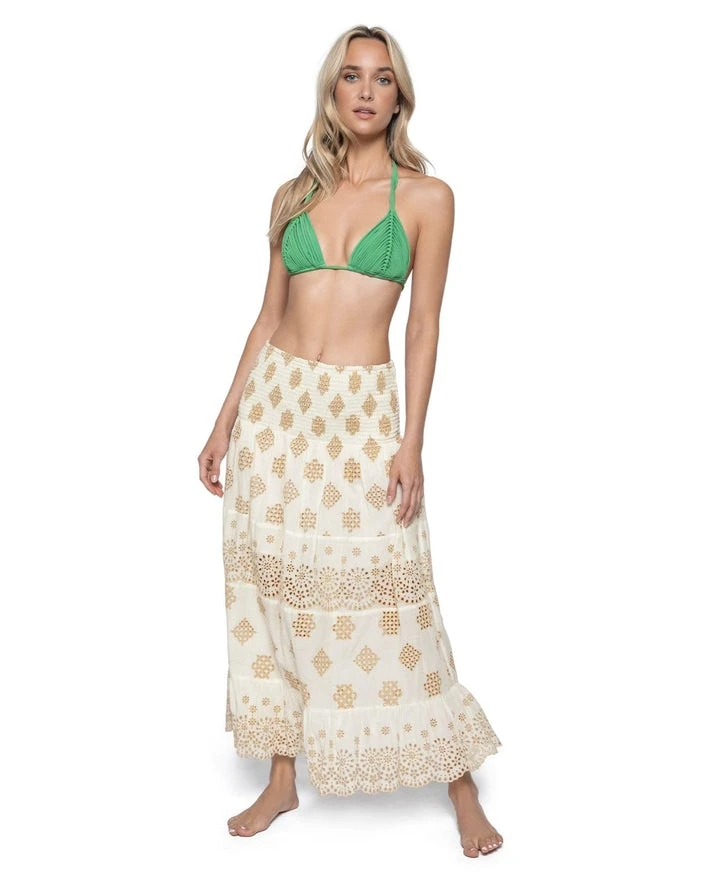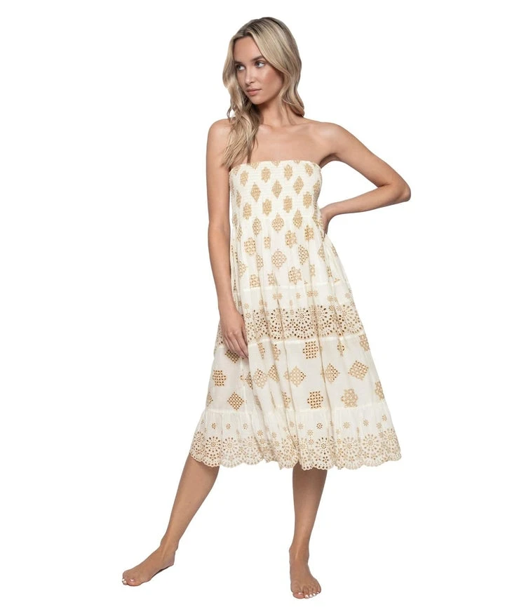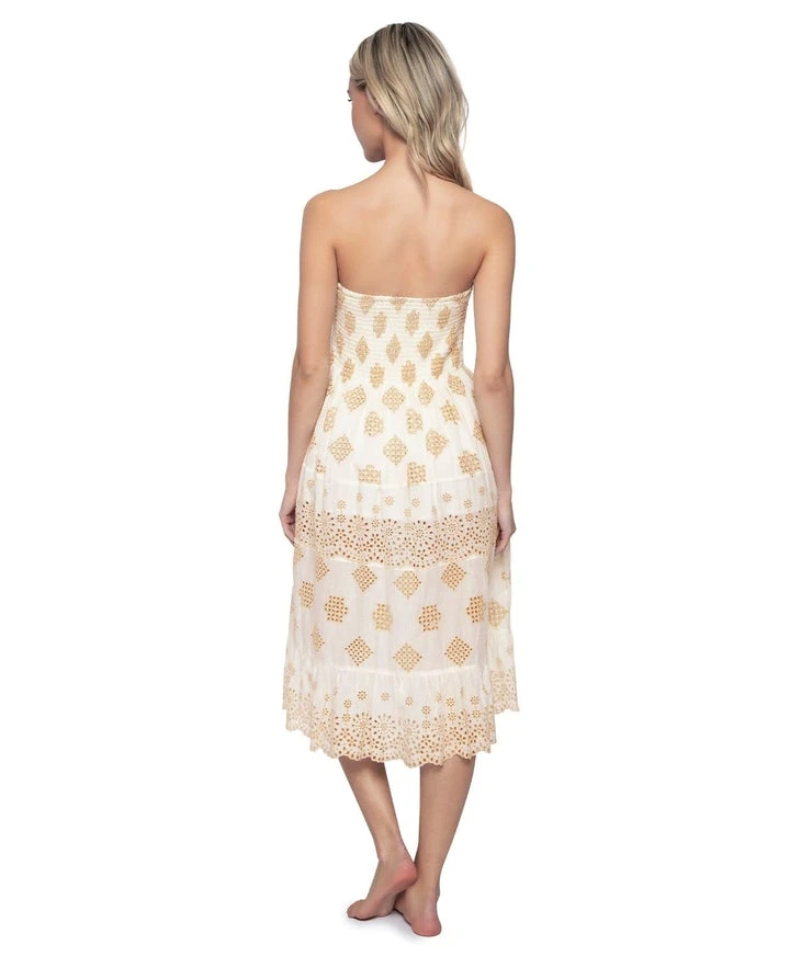 A cute PQ Swim cover up that can be worn as a skirt or strapless dress. Features smocked detailing and a ruffle trim as well as unique stitching and embroidered details.Â