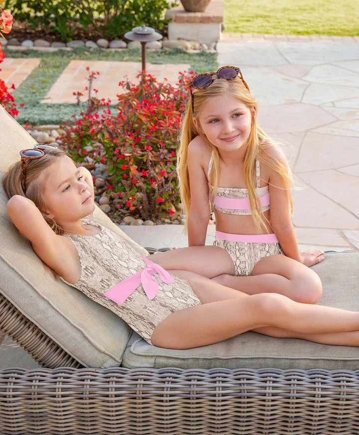 This high waist bikini offers a supportive top that ties around the neck and in the back. Featured in Kaa and moms can match their daughters in one of our Kaa suits for adults! If unsure what size to pick, size up.
