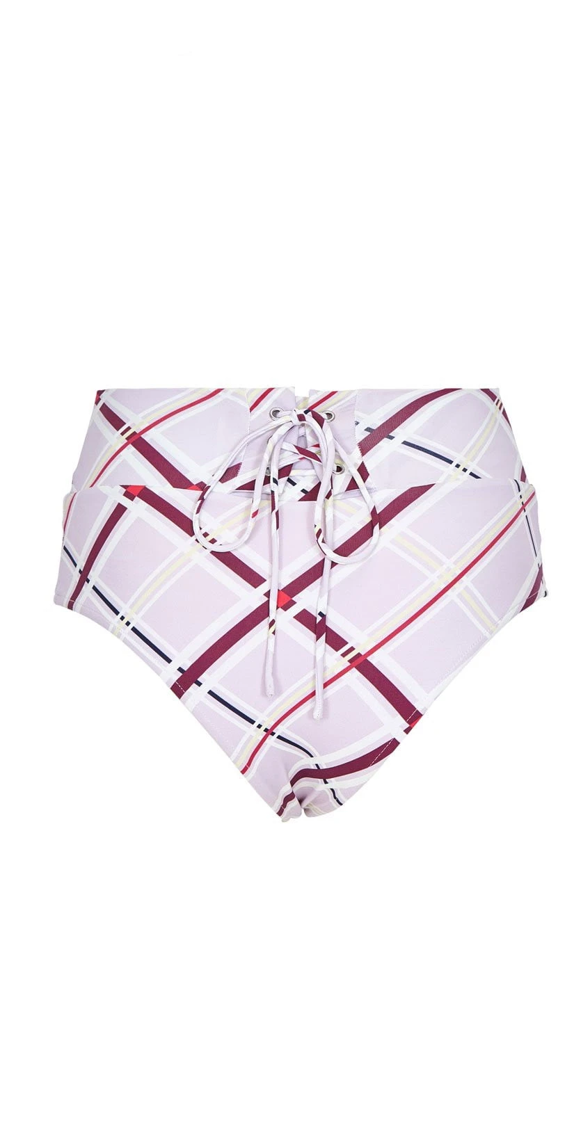 The Henley Bottom adds a modern twist to high waist bikini bottom with lace-up ties in the back. These bottoms feature a silver grommet detail and are made with luxurious textured swimwear fabric.
