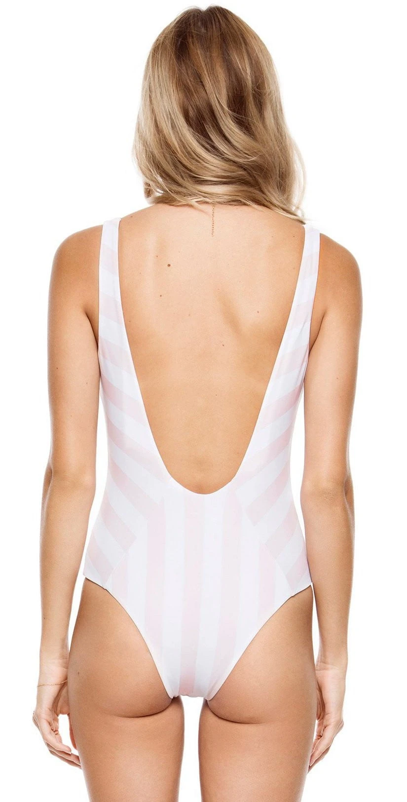 The Tori Praver Genevie One Piece Swimsuit is a blush and white chevron striped one piece with a scoop neck, no cups, a low scoop back and cheeky bottom coverage.