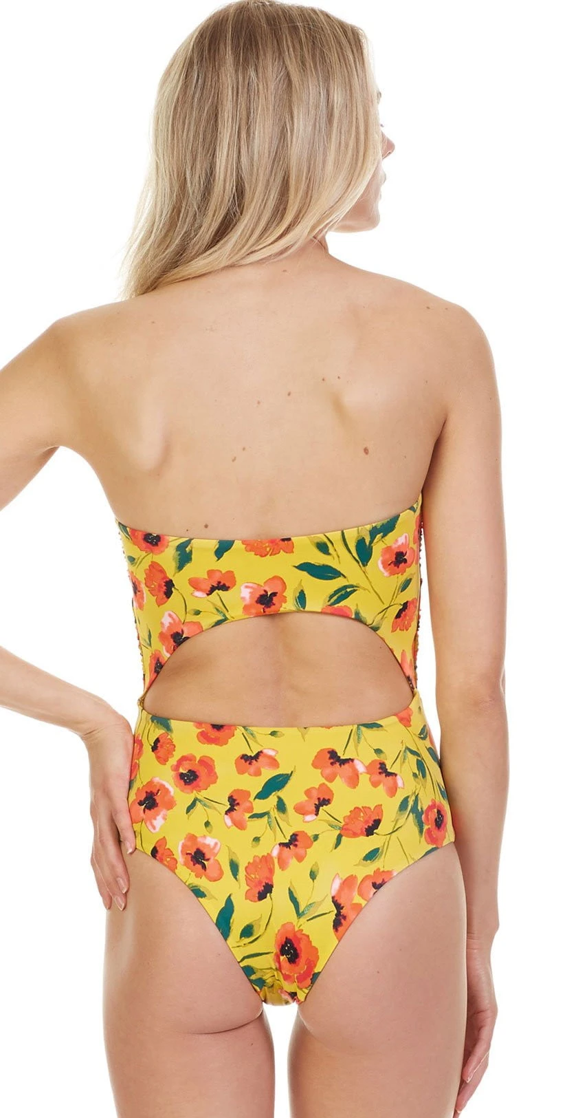 The Tori Praver Roux One Piece Swimsuit in French Poppyย is a cut out one piece with a floral poppy pattern. This one piece is sultry with a flair for the boho. This top features dual front ties with a cut out center front and back.