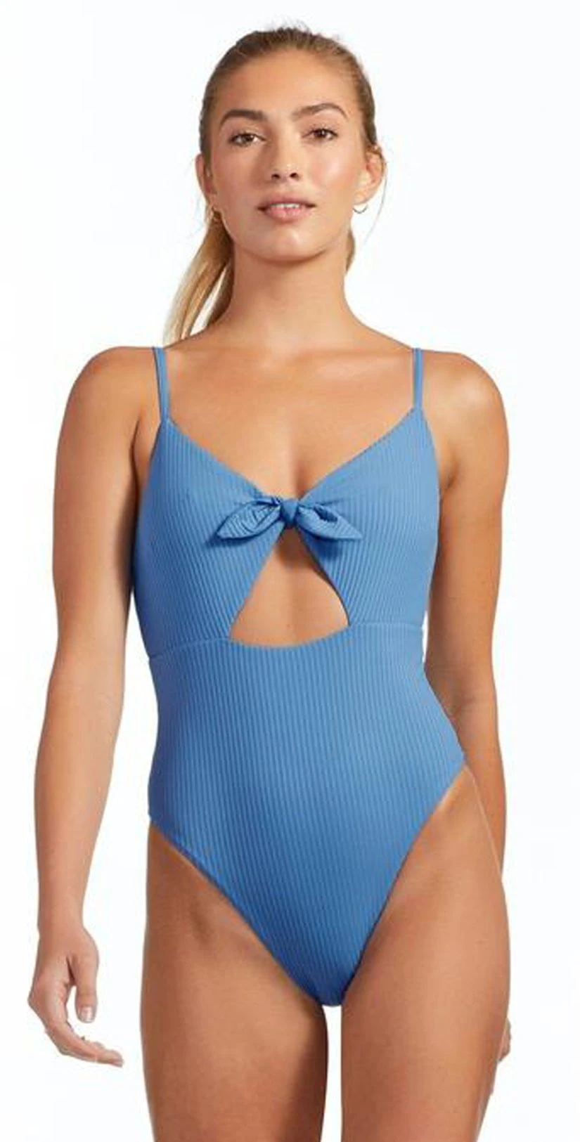 The Vitamin A EcoRib Alma One Piece Swimsuit features a front knot tie detail with adjustable spaghetti straps, a low scoop back and moderate to full bottom coverage.Â