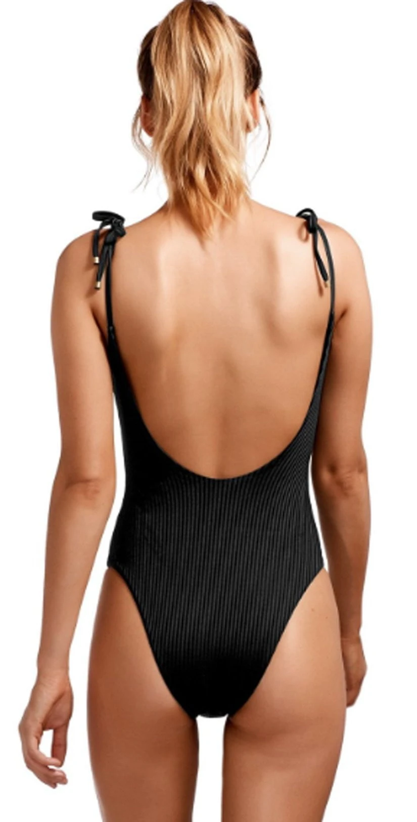 TheΒ Vitamin A Black EcoRib Valentina One Piece is a sexy high legΒ suit with a scoop back and adjustable tie straps. This ribbed bodysuit has an inner shelf bra and stretch lining to flatter multiple body types.Β