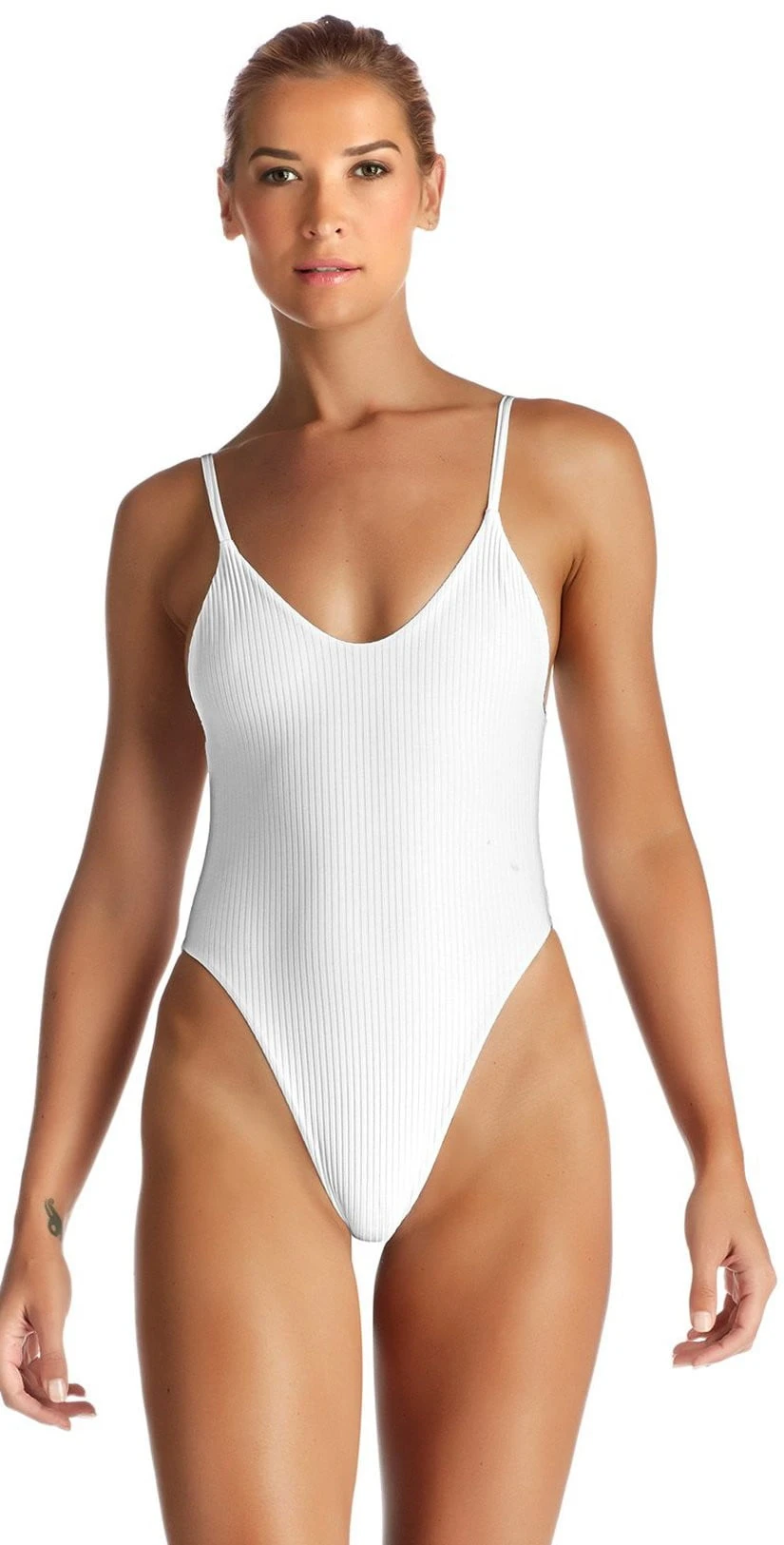 The Vitamin A  EcoRib Yasmeen One Piece in White is a sexy and sporty ribbed one-piece swimsuit. This suit features an open scoop back, thin adjustable tank straps and a Brazilian style bottom. This fully lined suit is made of 84% Recycled Nylon and 16% Lyrica.