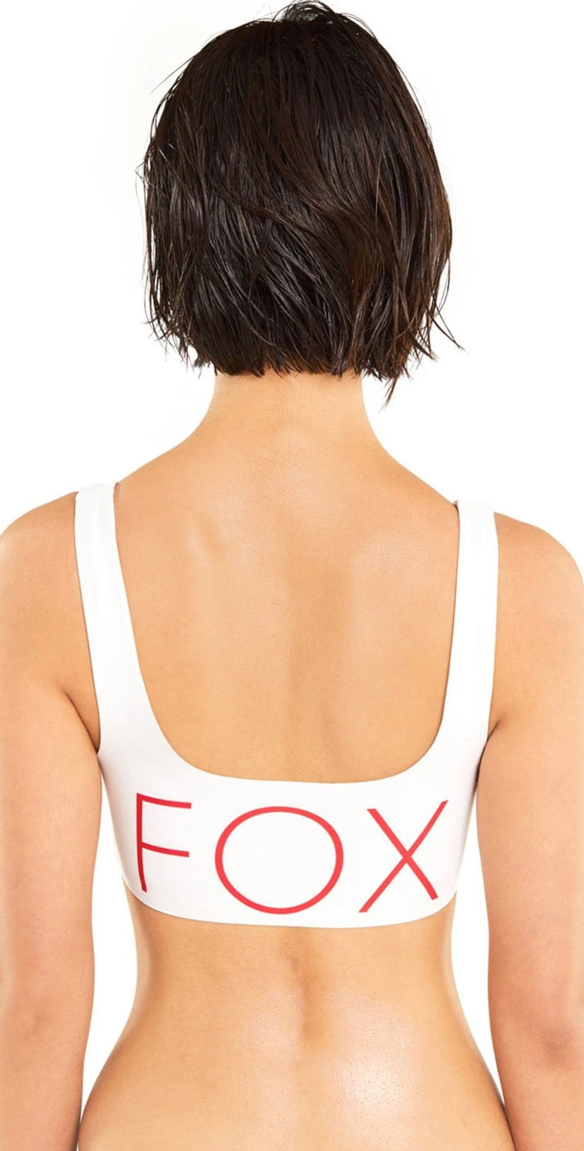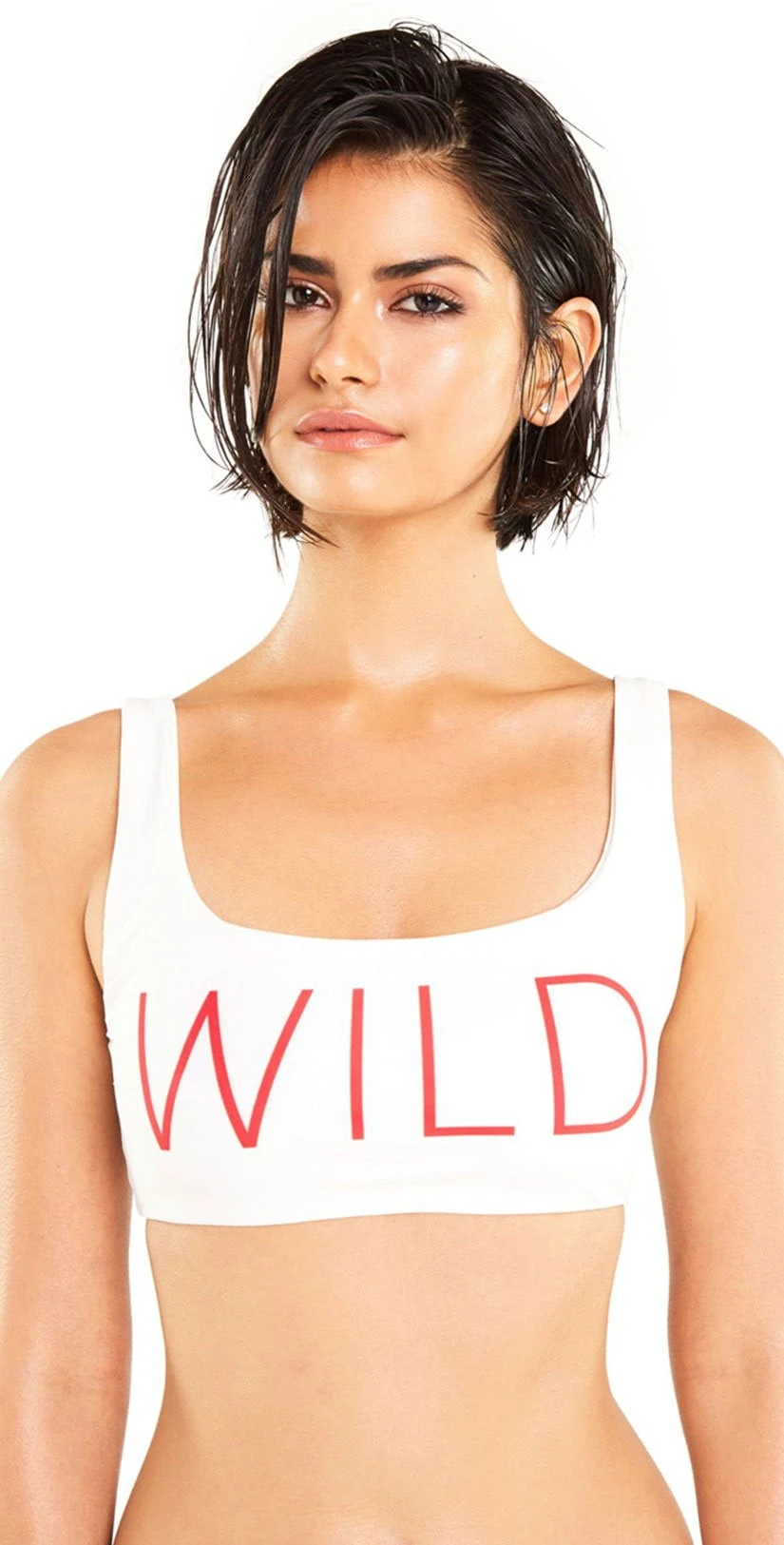 The Wildfox “Wild” Bikini Crop Top is a sporty white tank style top with red lettering “WILD” printed on the front and “FOX” printed on the back. Wide shoulder straps provide extra support while the scoop neckline flatters and exposes some cleavage for an overall sexy look. Pair with the matching Isabelle Bikini Bottom to complete the look!